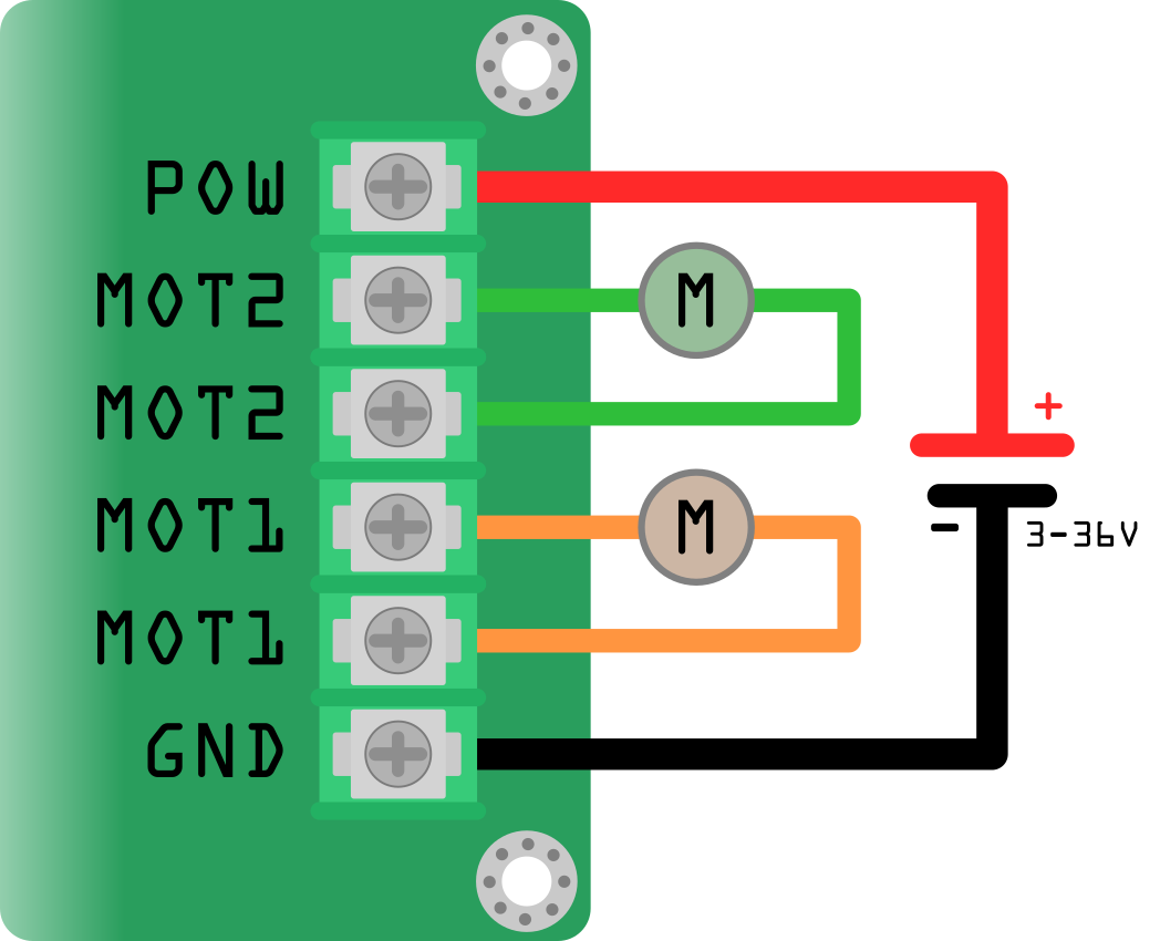 Sulla scheda motori troviamo a i due estremi i connettori per i segnali logici (Es. PWM1, DIR1...) e dall'altro lato i morsetti di potenza (Es. MOT1,MOT2...). Per connettere la scheda motori a un controllore generico basta seguire l'immagine qui sotto (Fig. 1), queste sono le connessioni minime per far funzionare la scheda con due motori, se si desidera controllare un motore solo si possono lasciare scollegati i pin non interessati (quindi PWM2, DIR2).